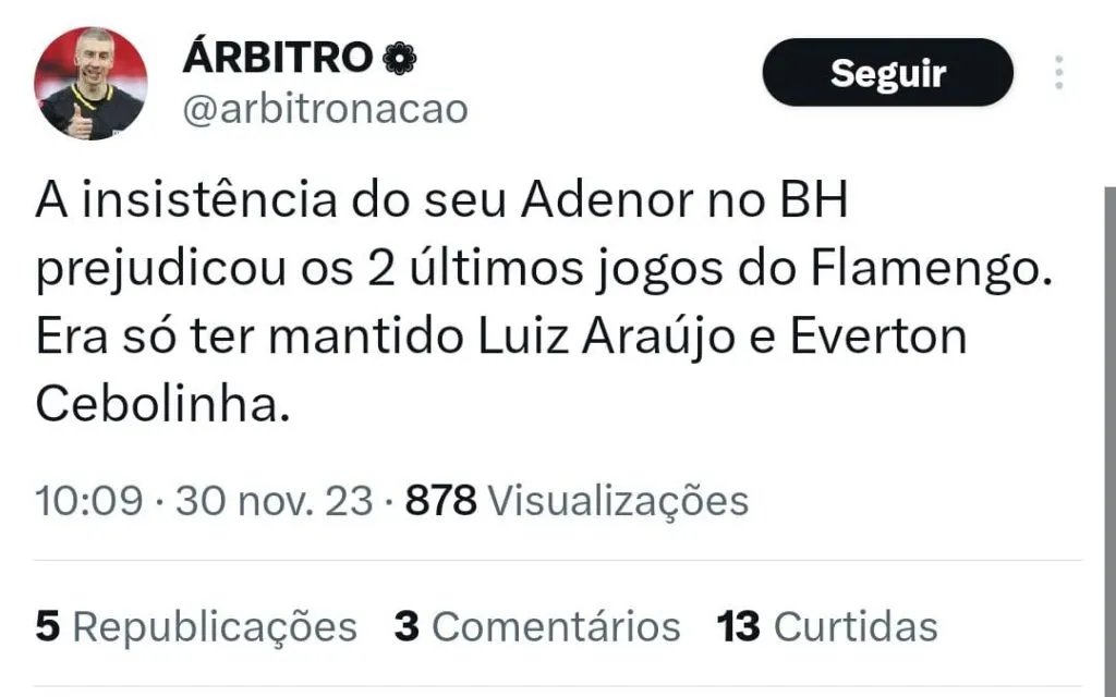 “Por mais mediano que seja, Luiz Araújo vinha entregando taticamente junto com Cebolinha. Eram eles que ofereciam consistência defensiva pelos lados, principalmente Araújo que tinha de segurar a onda dos inconsistentes Wesley e Matheuzinho. Foi pro banco por causa de 45 minutos ruins contra o Bragantino pra dar lugar a BH que não consegue realizar a função.”, escreveu um torcedor.