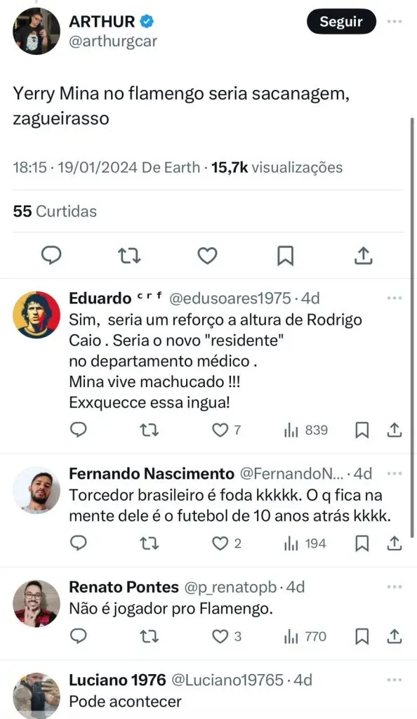 “Yerry Mina está mesmo de saída da Fiorentina. Foi associado recentemente ao FC Porto, mas tem neste momento uma negociação em andamento com um clube da Arábia Saudita. A ver os próximos passos do central colombiano”, disse.