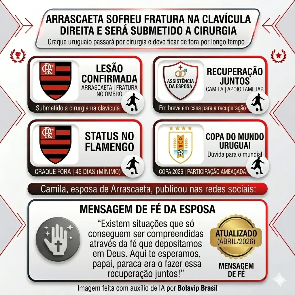 Esposa de Arrascaeta faz post após fratura na clavícula direita e cirurgia confirmada pelo Flamengo