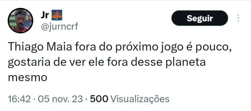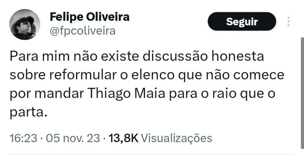 “O Thiago Maia é um desses jogadores que eu não sei se fica para o ano que vem. Pelo nível do futebol que tem apresentado das suas atuações, os equívocos, erros, falta de concentração… têm vários problemas. É um jogador que não se justifica hoje.“, avaliou o jornalista.
