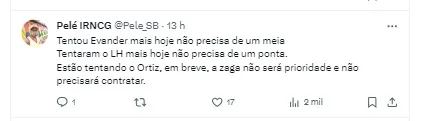 Porém, apesar disso, Marcos Braz negou a negociação com o meio-campista: “Zero, não tem nenhuma negociação. Até em respeito ao jogador, não é que seja chance zero. O que eu falei é que não tem nenhuma negociação em curso. Porque falar em chance zero é desrespeito com o jogador. Então, assim, eu estou falando que não tem nada em curso com esse jogador e nem nunca se iniciou.”