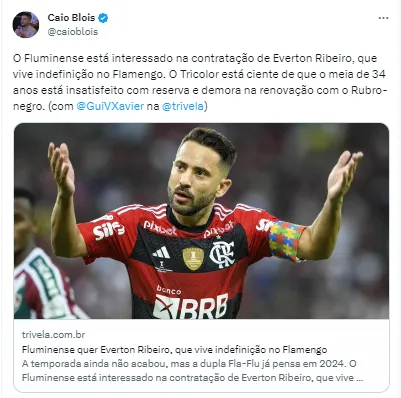 “O Fluminense está interessado na contratação de Everton Ribeiro, que vive indefinição no Flamengo. O Tricolor está ciente de que o meia de 34 anos está insatisfeito com a reserva e demora na renovação com o Rubro-Negro”, publicou o jornalista Caio Blois, do site Trivela, em seu perfil nas redes sociais.
