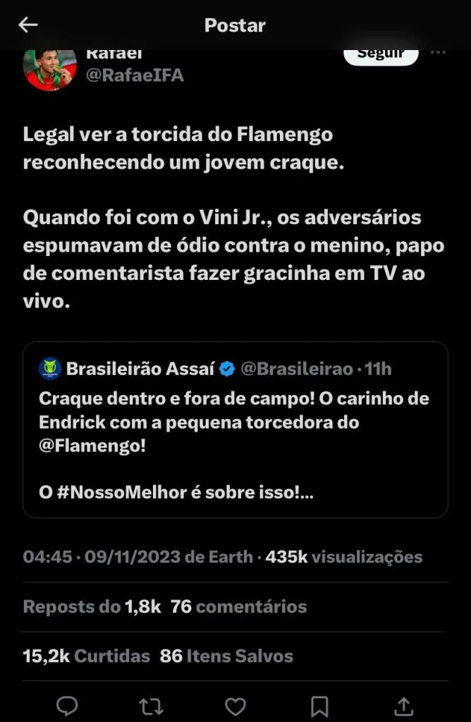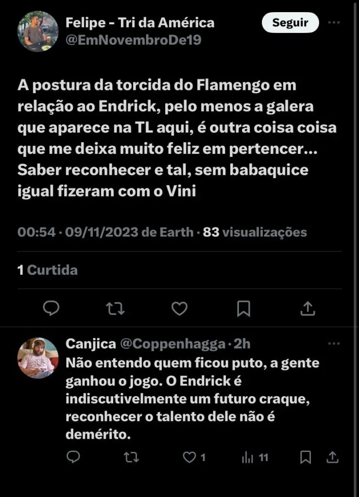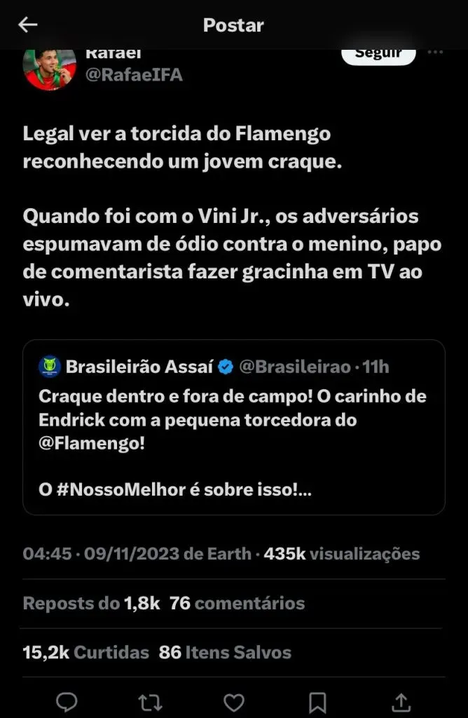 (SIC): “Legal ver a torcida do Flamengo reconhecendo um jovem craque. Quando foi com o Vini Jr, os adversários espumavam de ódio contra o menino”; “A torcida do Flamengo querendo tirar foto com ele mostra que estamos criando um novo ídolo”, foram alguns dos comentários sobre o camisa 9 do Palmeiras.