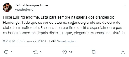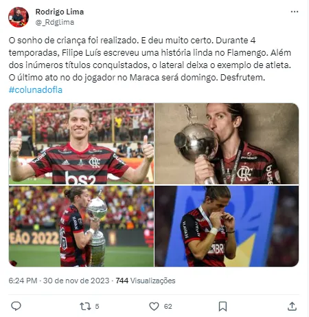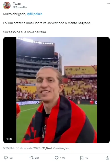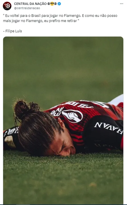 “Voltei ao Brasil para jogar no Flamengo, e como não posso jogar no Flamengo, prefiro me retirar e começar nova empreitada”, concluiu Filipe Luís ao se despedir da torcida do Flamengo em vídeo publicado nos canais oficiais do Rubro-Negro.