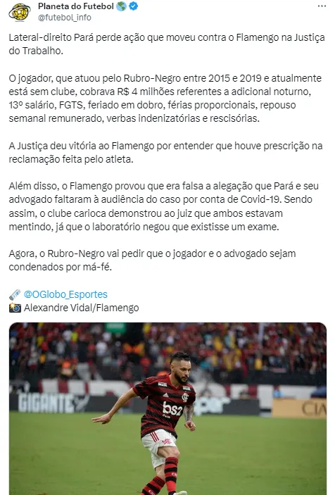 Na informação do jornal O Globo, porém, a Justiça do Trabalho deu vitória ao Flamengo por entender que “houve prescrição na reclamação feita pelo atleta”. Além disso, Pará foi acusado de apresentar alegações falsas ao faltar à audiência.