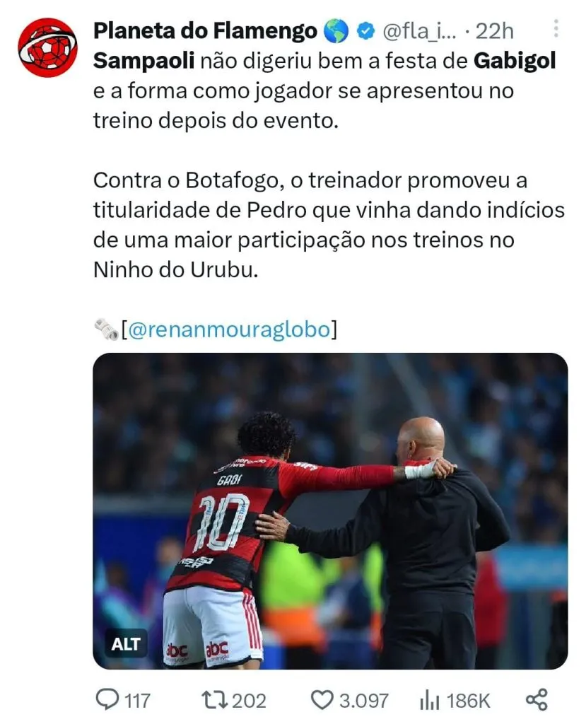 Além de ter se envolvido em algumas polêmicas nos últimos dias, incluindo uma troca de farpas com Marcos Braz, o atacante que tinha status de titular absoluto no time de Sampaoli, está vivendo uma fase ruim, um levantamento recente do GE, apontou que ele é o jogador mais ineficiente do Brasileirão 2023. Segundo Sampaoli, Gabigol vai precisar demonstrar empenho para recuperar a posição.