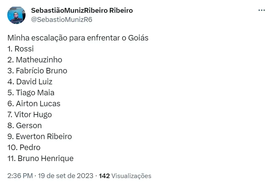 O treinador flamenguista tem nove baixas para o duelo em Goiânia: Arrascaeta, Luiz Araújo, Filipe Luís, Allan e Varela, que se recuperam de lesões, além de Pulgar e Léo Pereira, poupados com dores na coxa, e Wesley e Gabigol, que cumprem suspensão na 24ª rodada do Brasileirão, como informou o Globo Esporte. Com isso, os torcedores do Mengão no Twitter montaram o time ideal para entrar em campo contra o Esmeraldino.