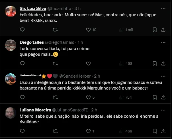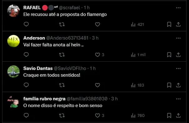 “Não cheguei a conversar diretamente com ele (Mário Bittencourt), mas sabia do interesse. Agradeço principalmente ao presidente do Fluminense, que sempre demonstrou carinho e admiração pelo meu futebol. Mas, com tudo que vivi no Flamengo e tudo que conquistei lá, eu não me sentiria bem de sair do Flamengo e ir para um rival logo de cara“, disse na entrevista.