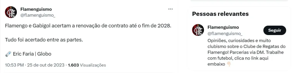 Quem também tratou de deixar sua marca foi o repórter Eric Faria, na transmissão da TV Globo, ao adiantar um negócio importantíssimo para o Mais Querido. Durante a partida, Eric falou na transmissão que o Flamengo está próximo de renovar com Gabigol até dezembro de 2028.