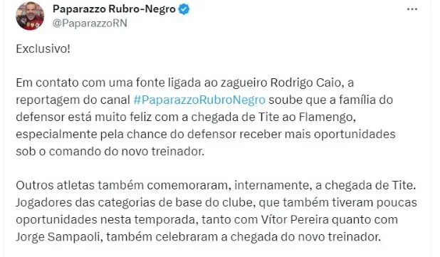 “Em contato com uma fonte ligada ao zagueiro Rodrigo Caio, a reportagem do canal #PaparazzoRubroNegro soube que a família do defensor está muito feliz com a chegada de Tite ao Flamengo, especialmente pela chance do defensor receber mais oportunidades sob o comando do novo treinador”, iniciou o perfil.
