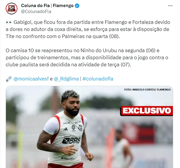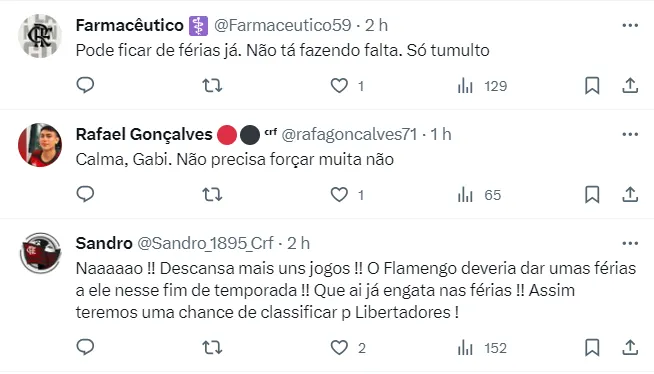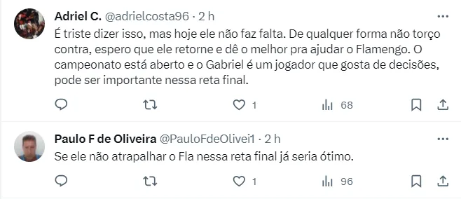 Outros destacaram a condição física de Gabigol, apontando que ele estaria fora de forma. Confira abaixo mais comentários da torcida do Fla após a notícia de retorno do jogador.