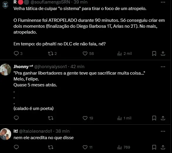 “Ai vem o bagre Melo falar “estavamos encaminhando para um possível empate””, “Segundo o Felipe Melo o empate estava próximo” e “Ainda tenho que ouvir entrevista do senhor Felipe Melo que antes da expulsão o Flu mandava no jogo”, foram alguns comentários.