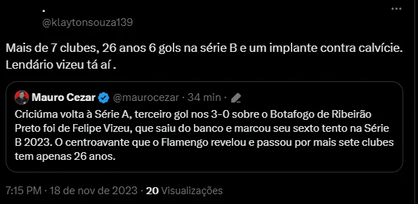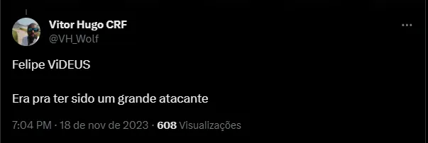 “Mais de 7 clubes, 26 anos, 6 gols na série B e um implante contra calvície. Lendário Vizeu tá aí”, “Felipe ViDEUS Era pra ter sido um grande atacante” e “Vizeu tá aí hein”, foram alguns dos comentários de flamenguistas.