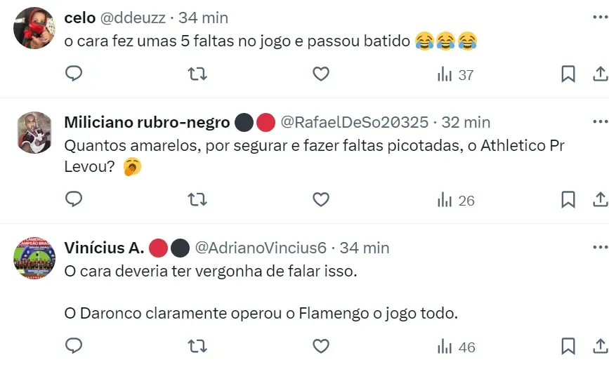 Nas redes sociais, os torcedores do Flamengo não gostaram da declaração do volante do Athletico e criticaram o juiz do jogo. A Nação reclamou do gol anulado de Gabigol, quando a partida ainda estava empatada por 0 a 0.