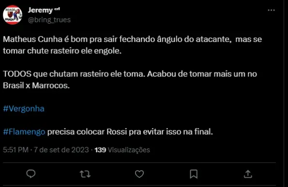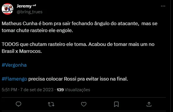 “Matheus Cunha é bom pra sair fechando ângulo do atacante, mas se tomar chute rasteiro ele engole. TODOS que chutam rasteiro ele toma. Acabou de tomar mais um no Brasil x Marrocos. Vergonha. Flamengo precisa colocar Rossi pra evitar isso na final”