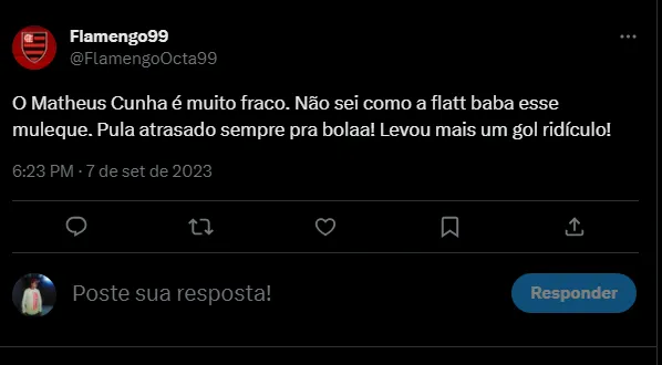 “O Matheus Cunha é muito fraco. Não sei como a Fla TT baba esse muleque. Pula atrasado sempre pra bolaa! Levou mais um gol ridículo!”