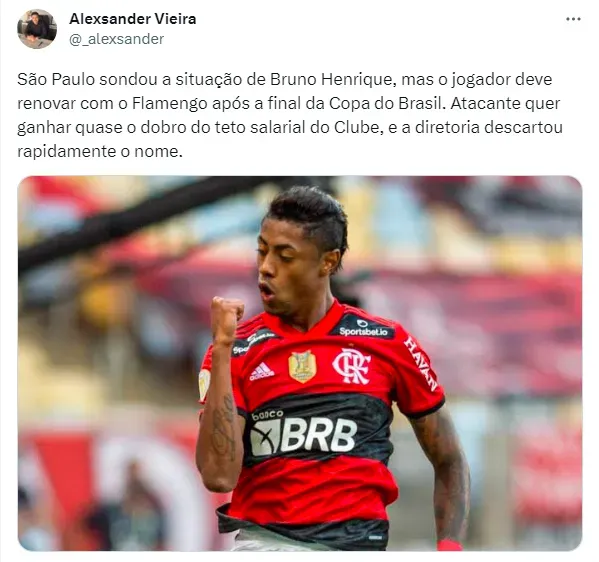 Falando no Tricolor Paulista, uma situação de um dos principais jogadores do Mais Querido foi muito falada nas últimas semanas. O nome do atacante Bruno Henrique foi comentado pela imprensa para defender o rival do Rubro-Negro do Rio de Janeiro, em 2024. No entanto, uma informação que surgiu neste sábado (9) pode fazer a Nação ficar mais tranquila.
