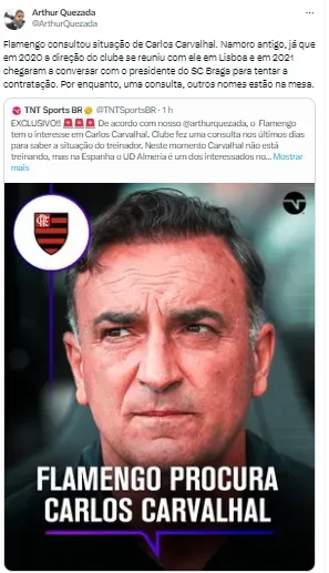 “Flamengo consultou situação de Carlos Carvalhal. Namoro antigo, já que em 2020 a direção do clube se reuniu com ele em Lisboa e em 2021 chegaram a conversar com o presidente do SC Braga para tentar a contratação. Por enquanto, uma consulta, outros nomes estão na mesa”, publicou Quezada em suas redes sociais.