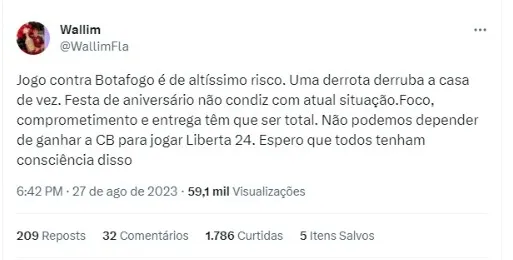 Inconformado com os rumos que o Flamengo pode caminhar, Wallim usou as suas redes sociais para expor o que pensa sobre a atual fase do clube. Além de, “prever” o que pode acontecer caso o Rubro-Negro perca no clássico para o Botafogo.