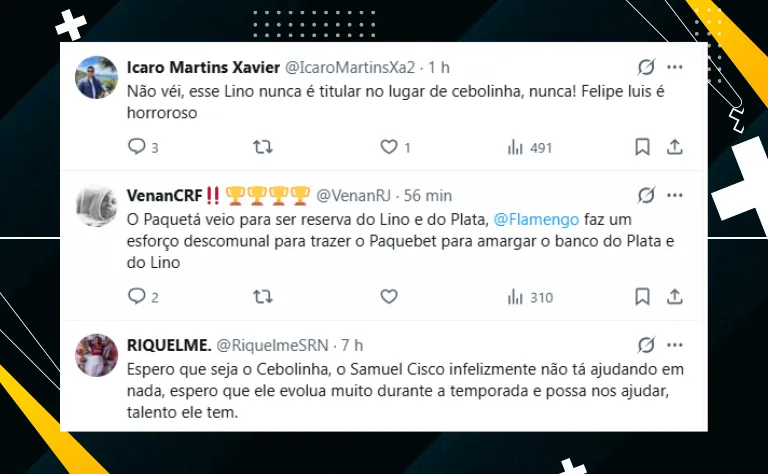 Ainda sobre os nomes à disposição do Flamengo, pode-se ressaltar que Lucas Paquetá foi regularizado e pode reestrear pelo Mais Querido. O jogador mais caro da história do futebol brasileiro está com o nome no Boletim Informativo Diário (BID) da CBF. Veja alguns comentários criticando a provável formação: