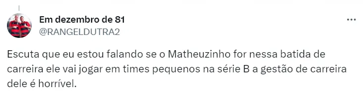 Em paralelo, o Flamengo está se movimentando nos bastidores e recebeu uma notícia não muito boa a respeito de Matheuzinho. O jogador está “afastado” do elenco até que sua situação seja resolvida.