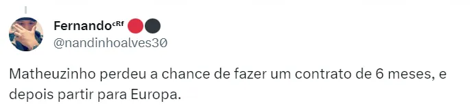 Matheuzinho chegou a fazer um período de treinos com o elenco do Corinthians. O Fla, por sua vez, demonstrou incômodo com a situação e alegou que liberou o jogador apenas para a realização de exames médicos.