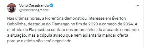 “Nas últimas horas, a Fiorentina demonstrou interesse em Éverton Cebolinha, destaque do Flamengo no fim de 2023 e começo de 2024”, informou o setorista, que cobre o mercado do futebol.
