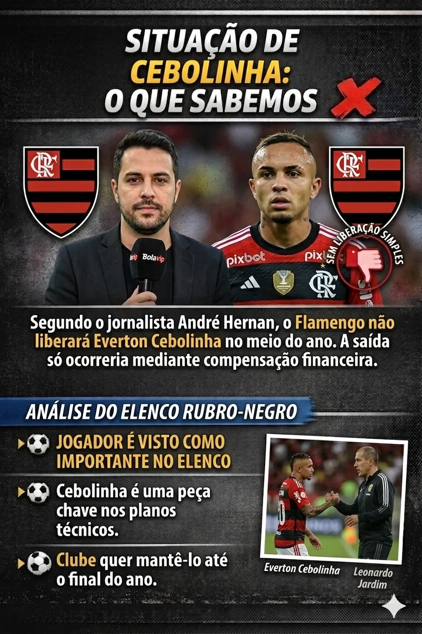 “O Flamengo não deve liberar Everton Cebolinha no meio do ano, somente mediante ao pagamento de uma compensação financeira, iniciou, dando mais detalhes sobre o motivo nos bastidores: