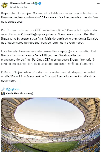 Ainda conforme as informações trazidas pelo portal NetFlu, o Flamengo agiu nos bastidores e conta com o apoio da Confederação Brasileira de Futebol para isso. Landim já teria entrado em contato com Ednaldo Rodrigues, presidente da CBF, para tratar do assunto e conseguir a liberação para jogar esta partida no Maracanã.