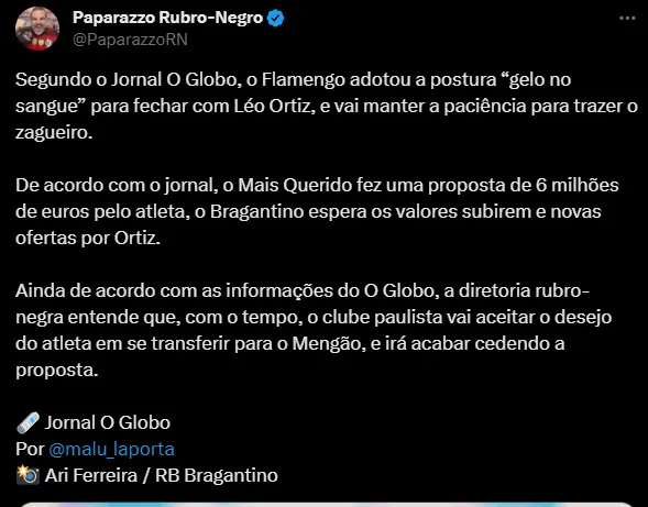 Agora, resta saber os próximos capítulos da negociação do Flamengo com Léo Ortiz. A postura do Fla não deve mudar e a diretoria confia em um final feliz para ambas as partes, apesar da postura do Bragantino.