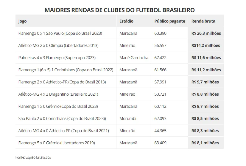 O top 10 das maiores rendas do futebol brasileiro