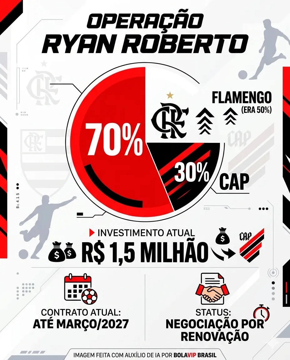 “O Flamengo comprou mais 20% do meia Ryan Roberto por R$1,5 milhão. Com isso, o Flamengo passa agora a ter 70% e Athletico fica com 30%“, informou o setorista.