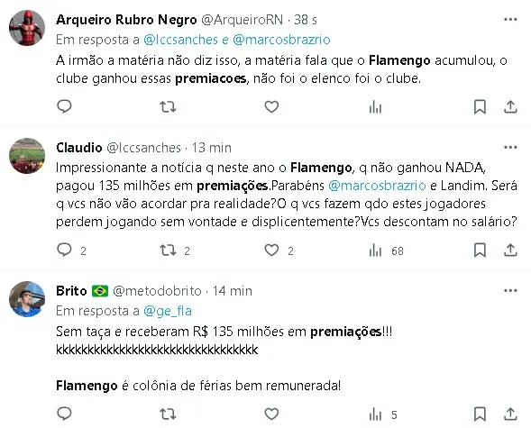 Na Libertadores, o Flamengo foi eliminado nas oitavas de final, mas a participação na competição garantiu aproximadamente R$ 25 milhões. No Brasileirão, o clube terminou em quarto lugar, assegurando a vaga direta para a Libertadores 2024 e recebendo R$ 40,6 milhões em premiação.