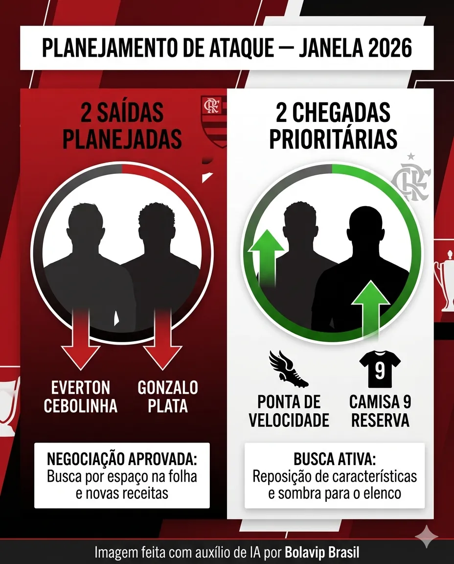 O ataque do Flamengo deve ter movimentações na próxima janela de transferências. Segundo informações do site MoonBH, a equipe deve contratar um ponta e pode negociar dois jogadores do seu elenco.
