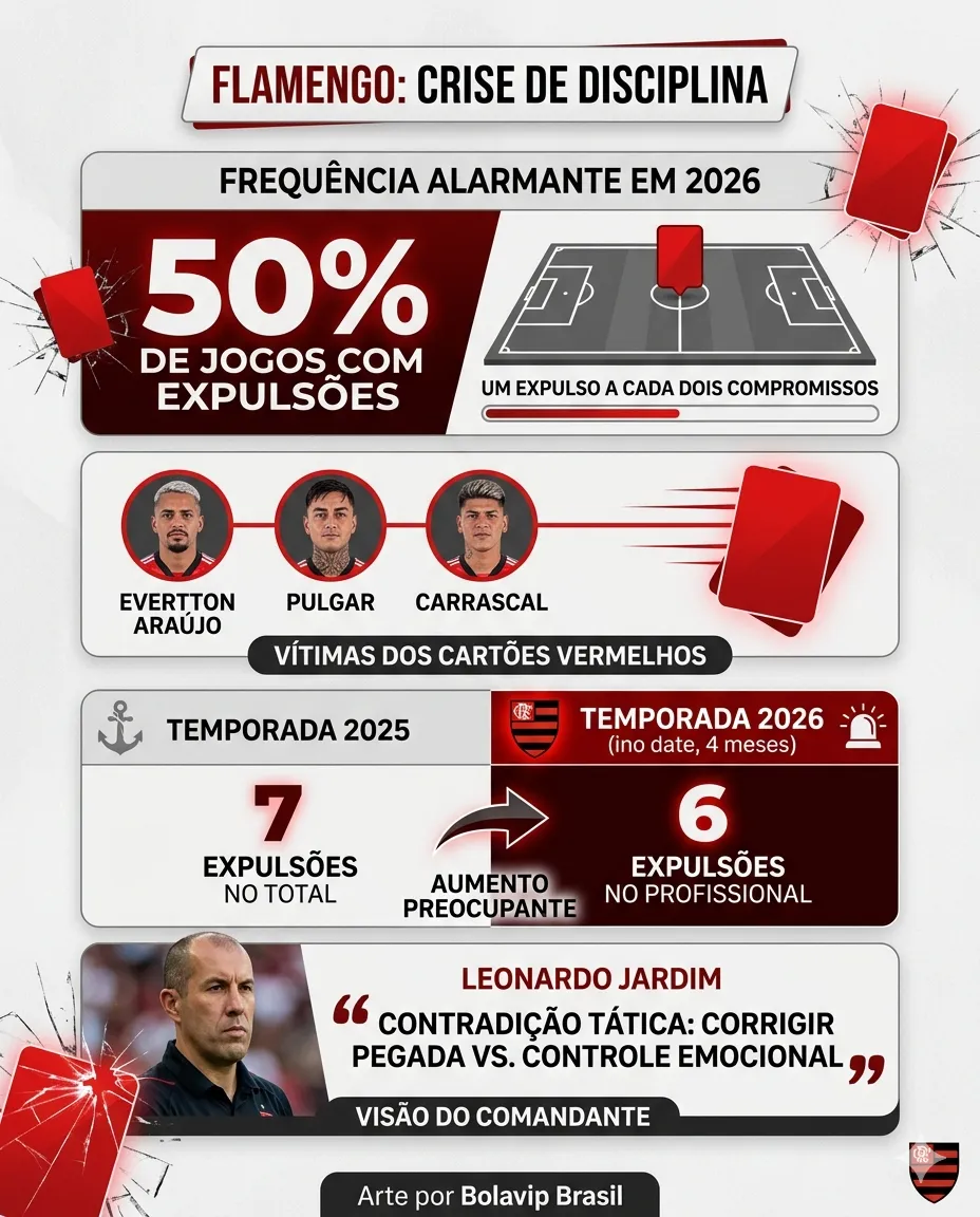 Jogar com 10 jogadores em 50% do tempo recente tem sobrecarregado o elenco e dificultado a manutenção de placares favoráveis. Em apenas 4 meses de 2026, o Flamengo já soma 6 expulsões no profissional. Para efeito de comparação: em todo o ano de 2025, foram apenas 7 cartões vermelhos.