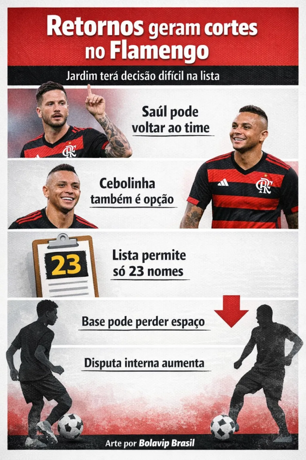 Caso apenas Saúl Ñíguez seja confirmado, o jovem Luiz Felipe, da base, aparece como principal candidato a deixar a lista. A decisão seguiria uma lógica comum de preservação do elenco principal em jogos decisivos.
