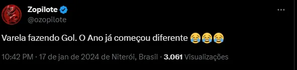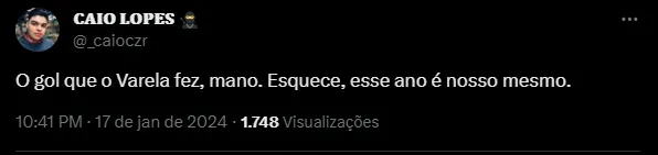 “O gol que o Varela fez, mano. Esquece, esse ano é nosso mesmo”, “Varela fazendo gol. O ano já começou diferente” e “Até o Varela metendo gol, que fase”, foram alguns dos comentários dos torcedores.