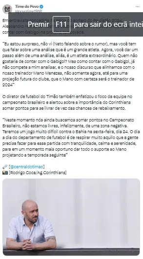 “Mas como contar com o Gabigol, já não compete a mim analisar, e o nosso discurso que alinhamos com o nosso treinador Mano Menezes, não somente agora, até para uma projeção futura do clube, que o Mano com certeza será o treinador de 2024″, concluiu ao Meu Timão.