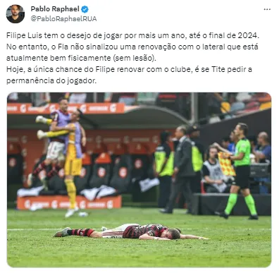 “Filipe Luís tem o desejo de jogar por mais um ano, até o final de 2024. No entanto, o Flamengo não sinalizou uma renovação com o lateral que está atualmente bem fisicamente (sem lesão). Hoje, a única chance do Filipe renovar com o clube, é se Tite pedir a permanência do jogador”, informou o comunicador Pablo Raphael, através de uma postagem nas suas redes sociais, sobre a decisão do lateral sobre seu futuro.