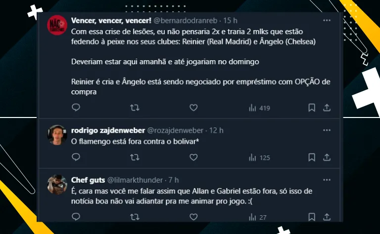 Vale frisar que Pedro e Gabi se lesionaram no jogo de ida das oitavas da Libertadores, o que deve abrir espaço para Carlinhos se manter entre os titulares no jogo de amanhã (22).