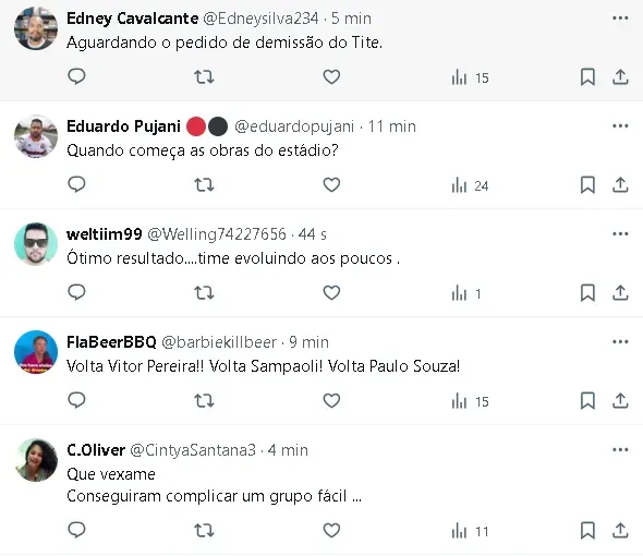 Nesse contexto de resultados adversos, cresce a pressão sobre o técnico Tite por parte da torcida rubro-negra, que espera uma reação imediata do time e questiona as escolhas táticas e o desempenho da equipe sob o comando do treinador.