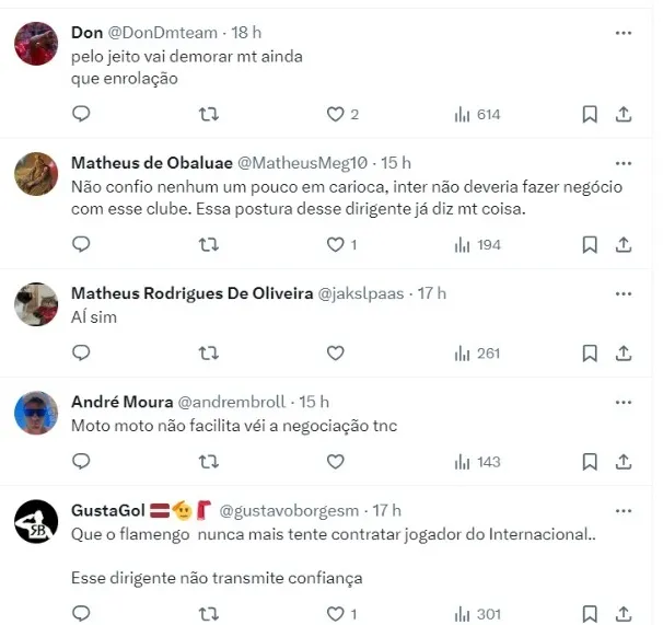 “Enquanto isso, o jogador segue treinando no Flamengo. O Fla aprendeu que só pode liberar o jogador quando estiver tudo assinado, ainda mais com o Corinthians. A chance do Matheuzinho ser vendido ao Corinthians é muito maior do que a de Thiago Maia ir para o Internacional”, falou o jornalista.