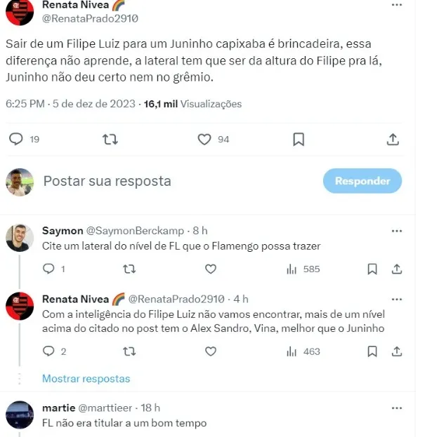 “#Flamengo tem interesse na contratação de Juninho Capixaba, do #RedBullBragantino. Lateral esquerdo, de 26 anos, que também joga de meia/ponta esquerda, seria um pedido de Tite, uma vez que #FilipeLuis se aposentou e o #RubroNegro conta apenas com Ayrton Lucas”, disse o jornalista David Sharp.
