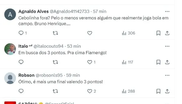 Um provável Flamengo para o duelo tem: Rossi, Varela, Fabrício Bruno, Léo Pereira e Ayrton Lucas; Erick Pulgar, De la Cruz e Arrascaeta; Bruno Henrique, Luiz Araújo e Pedro.