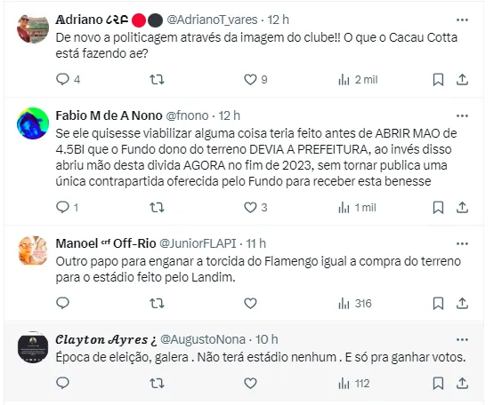 Cacau Cotta também se manifestou sobre a reunião: “Tivemos um encontro crucial na casa do prefeito Eduardo Paes e com o deputado Pedro Paulo sobre a construção do estádio do Flamengo. Eduardo afirmou seu compromisso público com a viabilidade da construção do estádio e a aquisição do terreno. Enquanto o deputado Pedro Paulo e o deputado Dr. Luizinho fortalecem a bancada rubro-negra em Brasília junto ao Governo Federal e à Caixa”, disse.