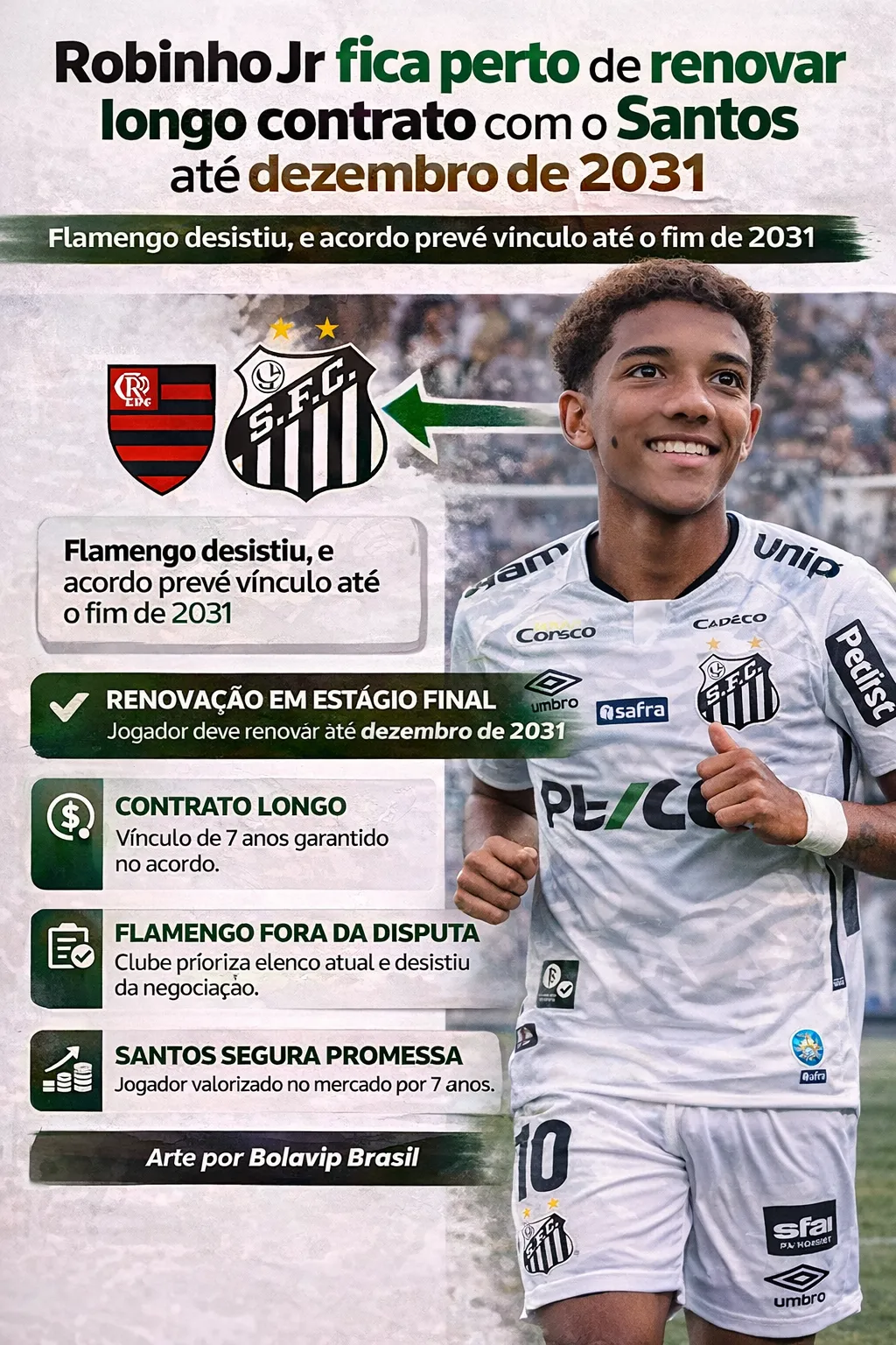 O Flamengo tomou uma decisão no mercado que agora ganha novos desdobramentos. O atacante Robinho Júnior está muito próximo de renovar contrato com o Santos até dezembro de 2031, após ter sido oferecido ao clube carioca no início da temporada.