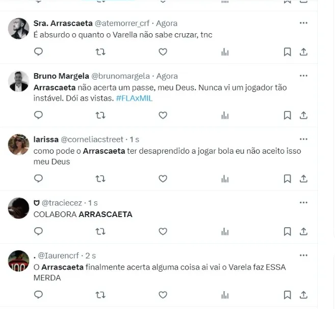 “Está insuportável assistir o Arrascaeta jogar nos últimos jogos, tem jogado muito mal, errando tudo, tá difícil assim“, escreveu um torcedor da equipe Rubro-Negra no X, antigo Twitter.