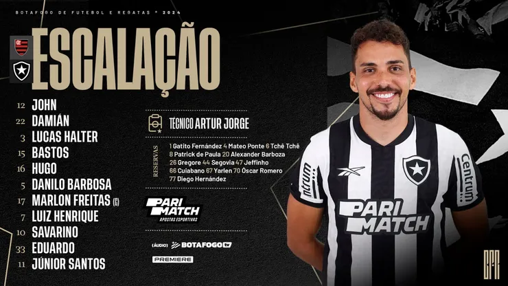 Artur Jorge vai a campo com: John, Damián, Lucas Halter, Bastos e Hugo; Danilo Barbosa, Marlon Freitas (C) e Savarino; Luiz Henrique, Eduardo e Junior Santos.
