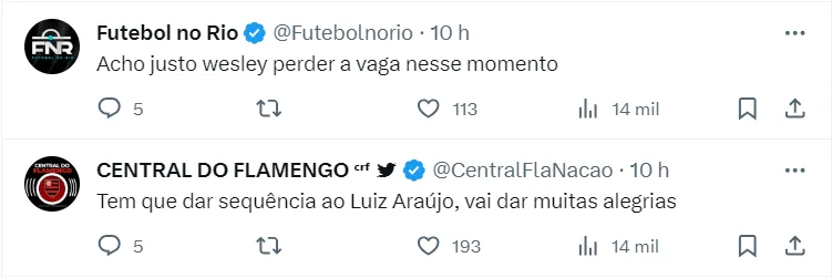 Além de optar pela manutenção de Matheuzinho no lugar de Wesley. O lateral já está recuperado da gastrenterite que o fez ficar de fora do jogo contra o Fortaleza. Mas, ainda assim, Tite optou em deixá-lo de fora dos 11 iniciais.
