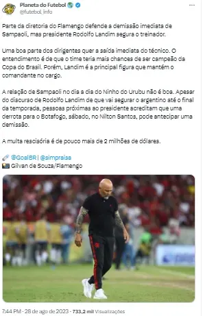 Conforme o Uol, uma derrota com má atuação para o Botafogo pode fazer com que aconteça uma reavaliação interna. No momento, quem banca o treinador argentino é o presidente Rodolfo Landim, mas até ele pode ser convencido a mudar de opinião dependendo do que aconteça na noite de hoje (2), no clássico.